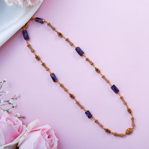 Amethyst beads were once worn by Roman statesmen who believed their deep purple colour enhanced clarity and protected against poor judgement. This gold beads mala draws from that same tradition, pairing textured gold beads with evenly spaced purple semi-precious stones for contrast and rhythm. The gold beads have intricate surface detailing that reflects light subtly, adding depth without making the design too ornate.