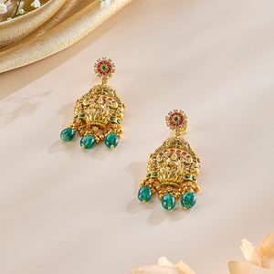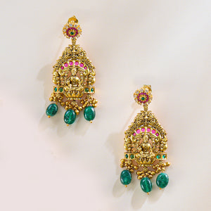 The necklace chain is composed of sculpted gold-plated beads in a repeating temple motif, which provides it with a solid yet flexible drape. The beads are cast with surface detailing that reflects light in matte gold tones. The matching danglers replicate the pendant, but in a smaller size, with a smaller Lakshmi figure, pink stone surround, and green bead fringe that swings with you.
