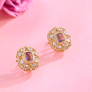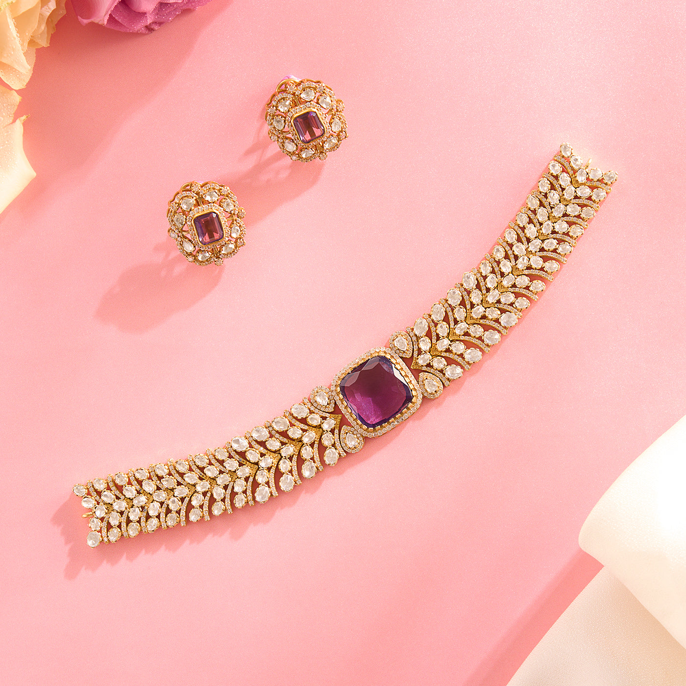 Part of our Chhavi collection, the choker sits close to the neck, with layers of white moissanite forming a cascading pattern. At the centre, a square-cut violet gemstone anchors the piece. Smaller white stones radiate outward in geometric lines that catch the light with every turn.