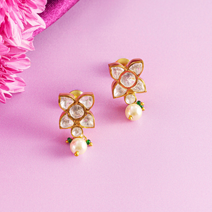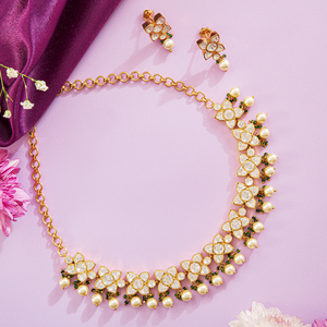 A polki-inspired necklace with moissanite florals, pearls, and green accents, paired with delicate earrings. Crafted in hallmarked silver with antique gold plating, Chhavi Collection reimagines Mughal charm with modern elegance..