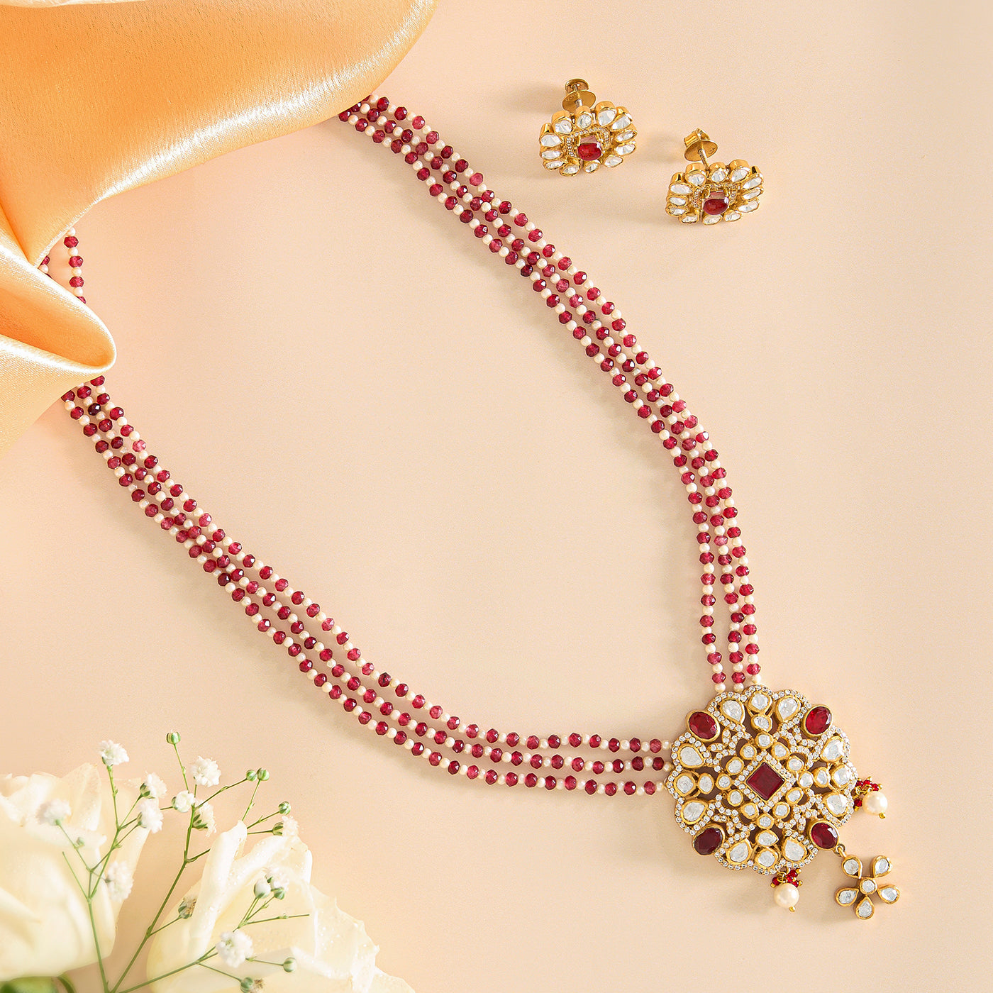 Part of our Chhavi collection, the necklace features three layers of red semi-precious beads, each strand falling at a different length. The longest holds an ornate polki pendant at the centre. White moissanite stones form the pendant's core, with red accents outlining the frame to mirror the beaded strands above.