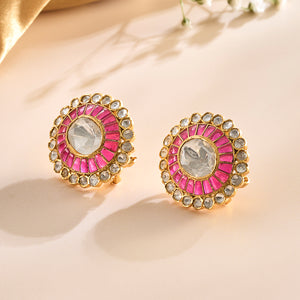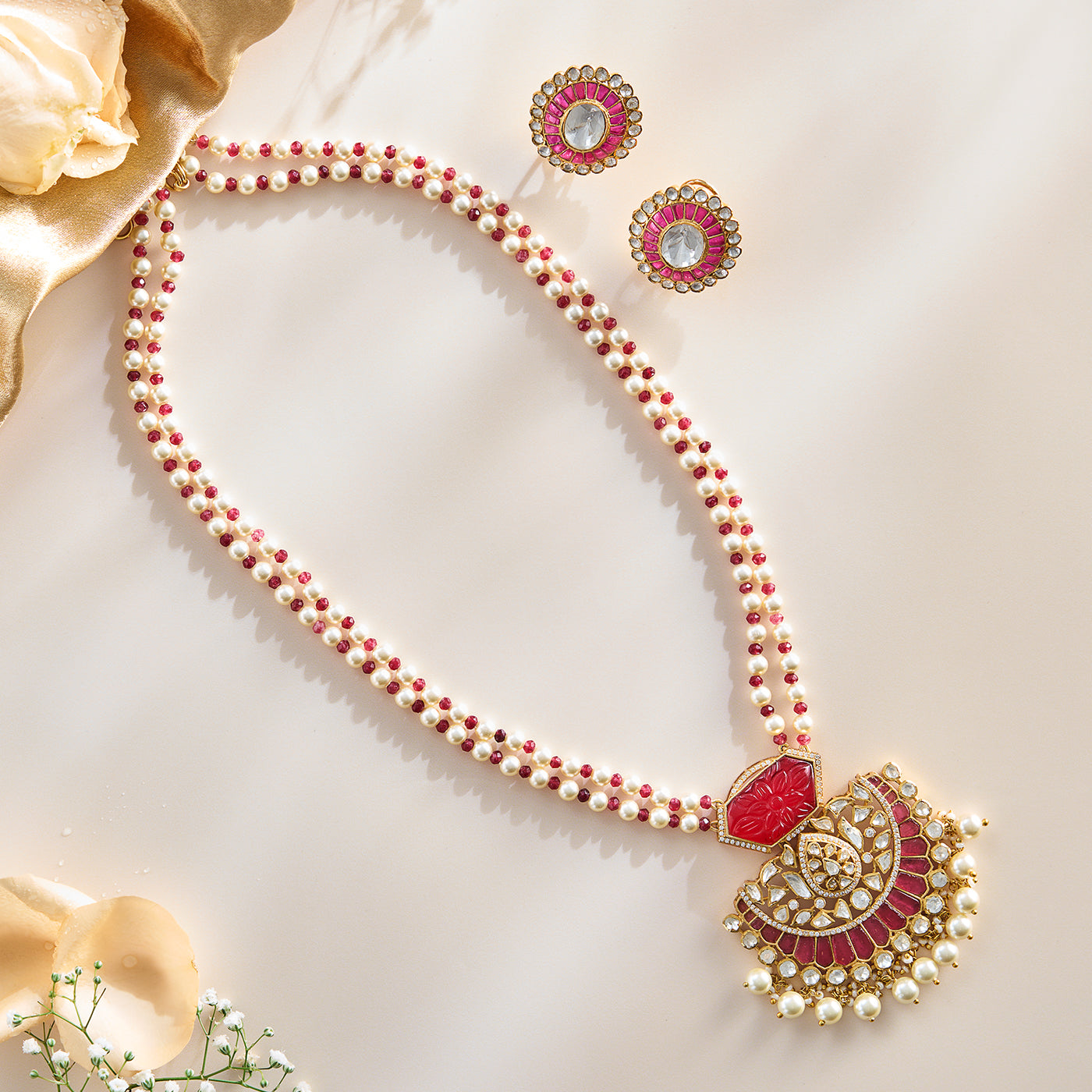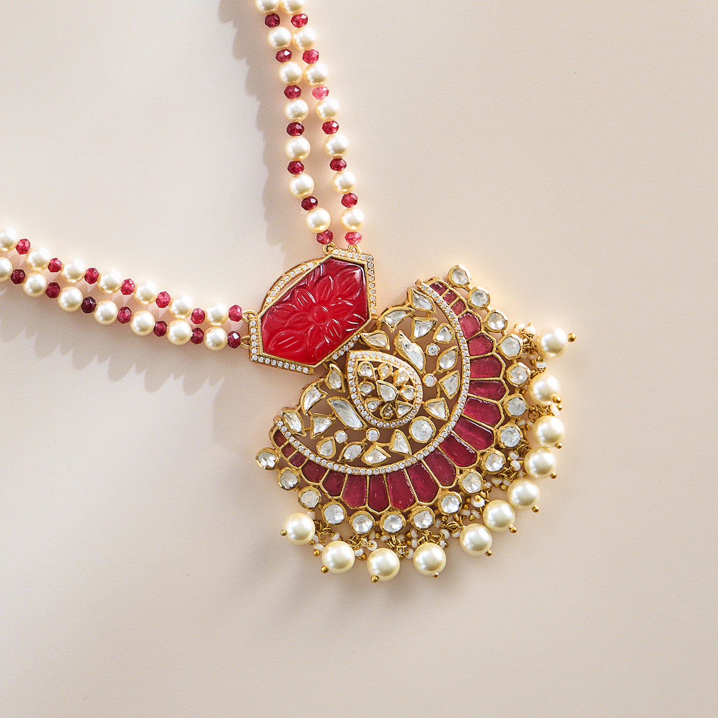 From our Chhavi collection, this polki necklace set in gold-plated sterling silver features a pearl chain, crescent pendant with red moissanite, white polki, and pearls balancing heritage elegance with everyday wearability.