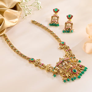 The Gold Lakshmi Devi Necklace Set from hallmarked 92.5% silver features the goddess lakshmi at the centre, with green and pink stones, gold-toned polish, and matching earrings timeless, graceful, meaningful.