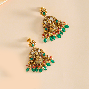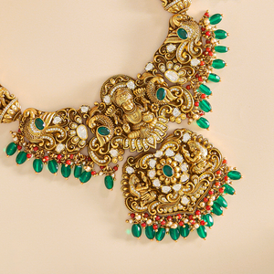 Lakshmi necklace set isn’t about sparkle for sparkle’s sake it’s about meaning that lingers. At its heart sits Goddess Lakshmi, radiating abundance and quiet strength. Look closer, and you’ll see intricate nakas detailing hand-carved peacocks, winding vines, and textures that feel almost sacred to the touch.
