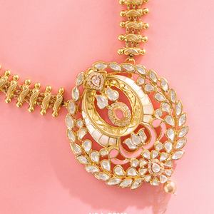 This Sukti Collection bridal long gold necklace set features a bold central pendant with moissanite, blush pink, ivory, and mother-of-pearl detailing, crafted in 92.5 hallmarked silver with a glowing gold finish.