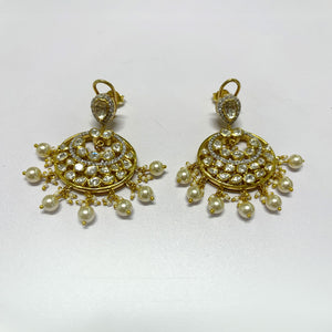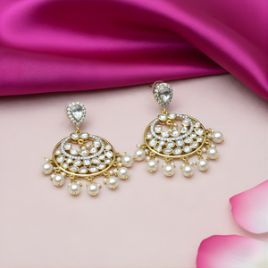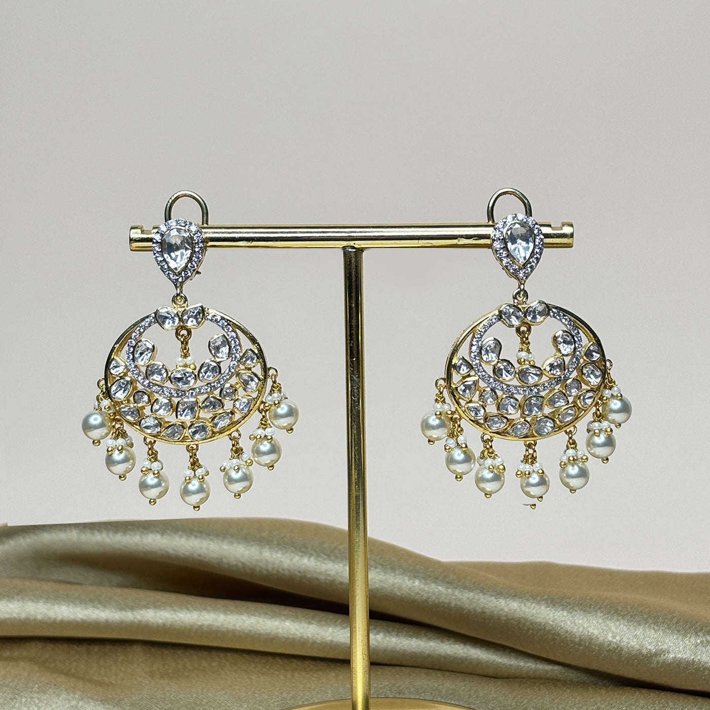 These polki pearl earrings in sterling silver gold plating feature elegant polki chandbali design with pearls. Perfect for festive and bridal wear, they exude timeless luxury and sophistication.