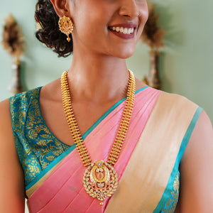 This Sukti Collection bridal long gold necklace set features a bold central pendant with moissanite, blush pink, ivory, and mother-of-pearl detailing, crafted in 92.5 hallmarked silver with a glowing gold finish.