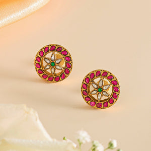 From our Saanjh collection, this sterling silver pendant set with matching studs blends pink, green, and gold in precise geometry hand-set, gold-plated, and crafted for festive elegance with authentic detail.