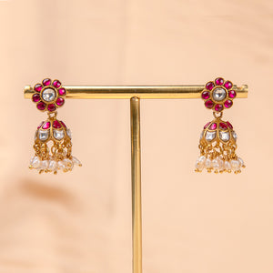 This Gold-Plated Kundan Necklace with jhumkas brings together the richness of hallmarked 925 sterling silver and the brilliance of pink and white stones. Highlighted by elegant peacock motifs and finished with soft pearl drops, the set captures the essence of traditional craftsmanship. The jhumkas complement the necklace, creating harmony in design and style.